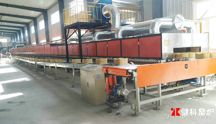 輥道窯的燃燒室在輥?zhàn)拥南路剑脡嚎s空氣霧化重油、柴油、煤油等燃料進(jìn)行燃燒。也有用煤氣發(fā)生爐所產(chǎn)煤氣進(jìn)行燃燒的,比較大型的陶瓷廠大都采用雙段冷煤氣站,使用冷靜煤氣進(jìn)行燃燒,產(chǎn)生高溫。燃燒室與輥道之間,有耐火材料隔離,火焰不直接接觸被燒制的產(chǎn)品。相對(duì)來(lái)說(shuō),煤氣發(fā)生爐配套輥道窯燃燒比重油、柴油等成本低,比直接燃煤效率高環(huán)保達(dá)標(biāo)。使用重油為燃料時(shí),為防止煙氣污染制品,要采取隔焰或半隔焰形式。電熱時(shí),為保護(hù)發(fā)熱體或使溫度更均勻,也需將發(fā)熱體和制品隔開(kāi)。